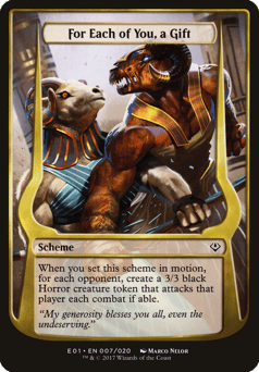 When you set this scheme in motion, for each opponent, create a 3/3 black Horror creature token that attacks that player each combat if able.