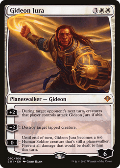 [+2]: During target opponent's next turn, creatures that player controls attack Gideon Jura if able. [−2]: Destroy target tapped creature. [0]: Until end of turn, Gideon Jura becomes a 6/6 Human Soldier creature that's still a planeswalker. Prevent all damage that would be dealt to him this turn.