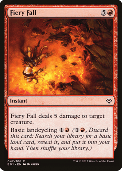 Fiery Fall deals 5 damage to target creature. Basic landcycling {1}{R} ({1}{R}, Discard this card: Search your library for a basic land card, reveal it, put it into your hand, then shuffle.)