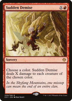 Choose a color. Sudden Demise deals X damage to each creature of the chosen color.