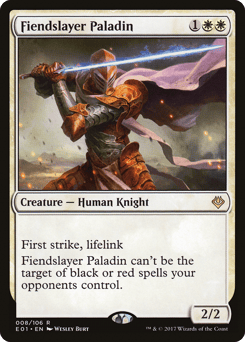 First strike (This creature deals combat damage before creatures without first strike.) Lifelink (Damage dealt by this creature also causes you to gain that much life.) This creature can't be the target of black or red spells your opponents control.