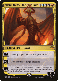 [+3]: Destroy target noncreature permanent. [−2]: Gain control of target creature. [−9]: Nicol Bolas deals 7 damage to target player or planeswalker. That player or that planeswalker's controller discards seven cards, then sacrifices seven permanents of their choice.