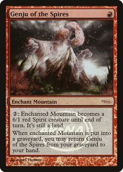 Enchant Mountain {2}: Enchanted Mountain becomes a 6/1 red Spirit creature until end of turn. It's still a land. When enchanted Mountain is put into a graveyard, you may return this card from your graveyard to your hand.