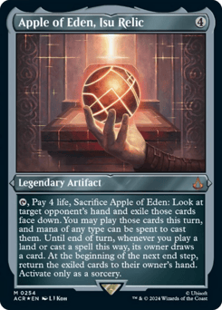 {T}, Pay 4 life, Sacrifice Apple of Eden: Look at target opponent's hand and exile those cards face down. You may play those cards this turn, and mana of any type can be spent to cast them. Until end of turn, whenever you play a land or cast a spell this way, its owner draws a card. At the beginning of the next end step, return the exiled cards to their owner's hand. Activate only as a sorcery.