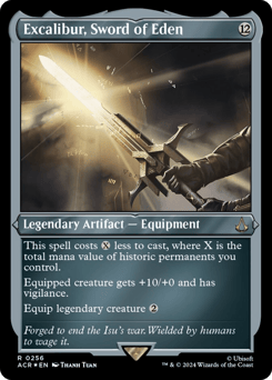 This spell costs {X} less to cast, where X is the total mana value of historic permanents you control. (Artifacts, legendaries, and Sagas are historic.) Equipped creature gets +10/+0 and has vigilance. Equip legendary creature {2}