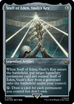 When Staff of Eden enters, put target legendary permanent card not named Staff of Eden, Vault's Key from a graveyard onto the battlefield under your control. {T}: Draw a card for each permanent you control but don't own.