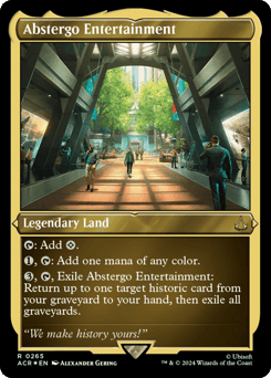 {T}: Add {C}. {1}, {T}: Add one mana of any color. {3}, {T}, Exile Abstergo Entertainment: Return up to one target historic card from your graveyard to your hand, then exile all graveyards. (Artifacts, legendaries, and Sagas are historic.)