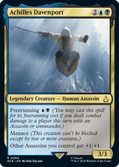 Menace Assassin spells you cast have freerunning {B}{B}. (You may cast a spell for its freerunning cost if you dealt combat damage to a player this turn with an Assassin or commander.) Whenever Ezio deals combat damage to a player, you may pay {W}{U}{B}{R}{G} if that player has 10 or less life. When you do, that player loses the game.
