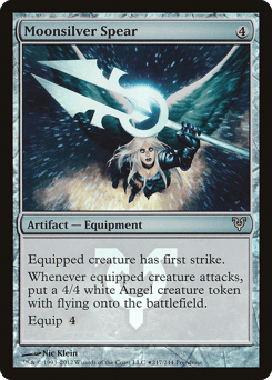 Equipped creature has first strike. Whenever equipped creature attacks, create a 4/4 white Angel creature token with flying. Equip {4}