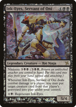 Ninjutsu {3}{B}{B} ({3}{B}{B}, Return an unblocked attacker you control to hand: Put this card onto the battlefield from your hand tapped and attacking.) Whenever Ink-Eyes deals combat damage to a player, you may put target creature card from that player's graveyard onto the battlefield under your control. {1}{B}: Regenerate Ink-Eyes.
