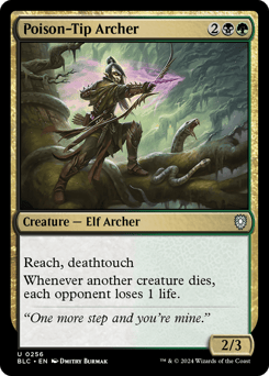 Reach (This creature can block creatures with flying.) Deathtouch (Any amount of damage this deals to a creature is enough to destroy it.) Whenever another creature dies, each opponent loses 1 life.