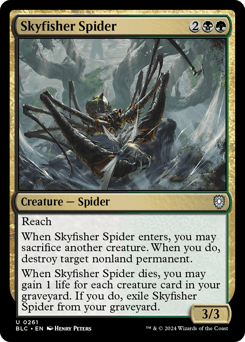 Reach When this creature enters, you may sacrifice another creature. When you do, destroy target nonland permanent. When this creature dies, you may gain 1 life for each creature card in your graveyard. If you do, exile this creature from your graveyard.
