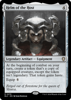At the beginning of combat on your turn, create a token that's a copy of equipped creature, except the token isn't legendary. That token gains haste. Equip {5}