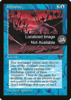 You and target player exchange control of the creature you each control with the greatest mana value. Then exchange control of artifacts the same way. If two or more permanents a player controls are tied for greatest, their controller chooses one of them.