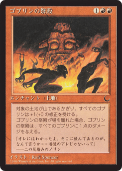 Enchant land As long as enchanted land is a basic Mountain, Goblin creatures get +1/+0. When this Aura leaves the battlefield, it deals 1 damage to each Goblin creature.