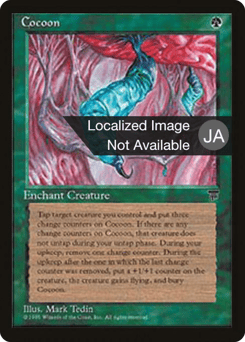 Enchant creature you control When this Aura enters, tap enchanted creature and put three pupa counters on this Aura. Enchanted creature doesn't untap during your untap step if this Aura has a pupa counter on it. At the beginning of your upkeep, remove a pupa counter from this Aura. If you can't, sacrifice it, put a +1/+1 counter on enchanted creature, and that creature gains flying.