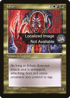 At the beginning of combat on your turn, you may have Johan gain "Johan can't attack" until end of combat. If you do, attacking doesn't cause creatures you control to tap this combat if Johan is untapped.