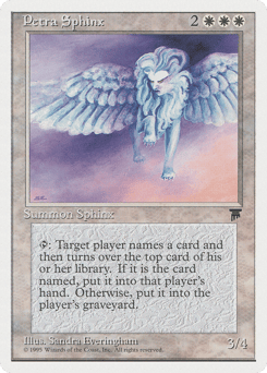 {T}: Target player chooses a card name, then reveals the top card of their library. If that card has the chosen name, that player puts it into their hand. If it doesn't, the player puts it into their graveyard.