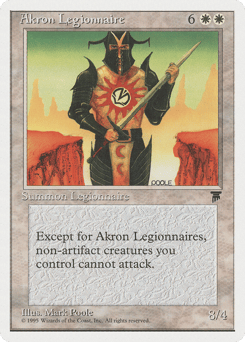 Except for creatures named Akron Legionnaire and artifact creatures, creatures you control can't attack.