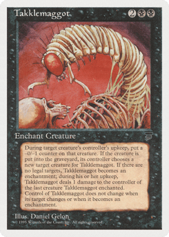 Enchant creature At the beginning of the upkeep of enchanted creature's controller, put a -0/-1 counter on that creature. When enchanted creature dies, that creature's controller chooses a creature that this card could enchant. If the player does, return this card to the battlefield under your control attached to that creature. If they don't, return this card to the battlefield under your control as a non-Aura enchantment. It loses "enchant creature" and gains "At the beginning of that player's upkeep, this enchantment deals 1 damage to that player."