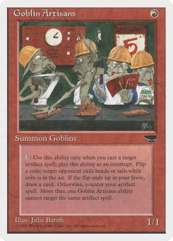 {T}: Flip a coin. If you win the flip, draw a card. If you lose the flip, counter target artifact spell you control that isn't the target of an ability from another creature named Goblin Artisans.