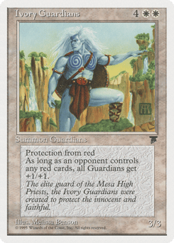 Protection from red Creatures named Ivory Guardians get +1/+1 as long as an opponent controls a nontoken red permanent.