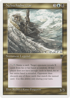 {X}, {T}: Choose a card name. Target opponent reveals X cards at random from their hand. Then that player discards all cards with that name revealed this way. Activate only during your turn.