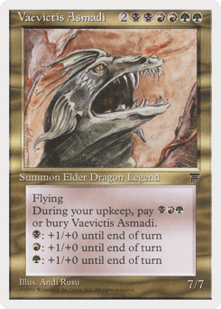 Flying At the beginning of your upkeep, sacrifice Vaevictis Asmadi unless you pay {B}{R}{G}. {B}: Vaevictis Asmadi gets +1/+0 until end of turn. {R}: Vaevictis Asmadi gets +1/+0 until end of turn. {G}: Vaevictis Asmadi gets +1/+0 until end of turn.
