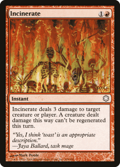 Incinerate deals 3 damage to any target. A creature dealt damage this way can't be regenerated this turn.