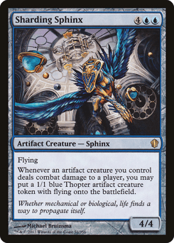 Flying Whenever an artifact creature you control deals combat damage to a player, you may create a 1/1 blue Thopter artifact creature token with flying.