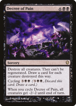 Destroy all creatures. They can't be regenerated. Draw a card for each creature destroyed this way. Cycling {3}{B}{B} ({3}{B}{B}, Discard this card: Draw a card.) When you cycle this card, all creatures get -2/-2 until end of turn.