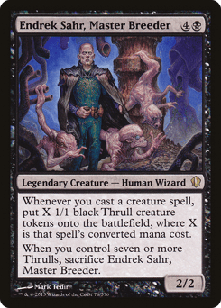 Whenever you cast a creature spell, create X 1/1 black Thrull creature tokens, where X is that spell's mana value. When you control seven or more Thrulls, sacrifice Endrek Sahr.