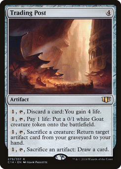 {1}, {T}, Discard a card: You gain 4 life. {1}, {T}, Pay 1 life: Create a 0/1 white Goat creature token. {1}, {T}, Sacrifice a creature: Return target artifact card from your graveyard to your hand. {1}, {T}, Sacrifice an artifact: Draw a card.