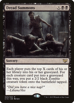 Each player mills X cards. For each creature card put into a graveyard this way, you create a tapped 2/2 black Zombie creature token. (To mill a card, a player puts the top card of their library into their graveyard.)