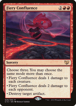 Choose three. You may choose the same mode more than once. • Fiery Confluence deals 1 damage to each creature. • Fiery Confluence deals 2 damage to each opponent. • Destroy target artifact.