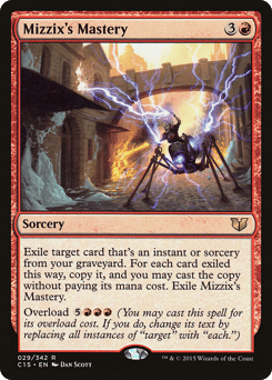 Exile target card that's an instant or sorcery from your graveyard. For each card exiled this way, copy it, and you may cast the copy without paying its mana cost. Exile Mizzix's Mastery. Overload {5}{R}{R}{R} (You may cast this spell for its overload cost. If you do, change "target" in its text to "each.")