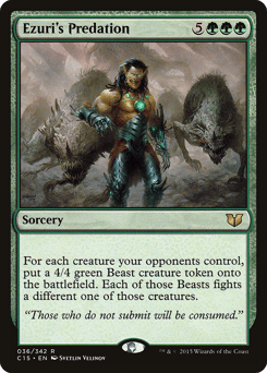 For each creature your opponents control, create a 4/4 green Phyrexian Beast creature token. Each of those tokens fights a different one of those creatures.