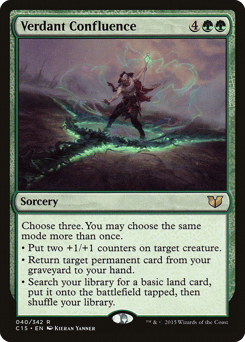 Choose three. You may choose the same mode more than once. • Put two +1/+1 counters on target creature. • Return target permanent card from your graveyard to your hand. • Search your library for a basic land card, put it onto the battlefield tapped, then shuffle.