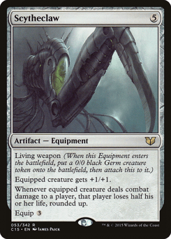 Living weapon (When this Equipment enters, create a 0/0 black Phyrexian Germ creature token, then attach this to it.) Equipped creature gets +1/+1. Whenever equipped creature deals combat damage to a player, that player loses half their life, rounded up. Equip {3}