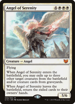 Flying When this creature enters, you may exile up to three other target creatures from the battlefield and/or creature cards from graveyards. When this creature leaves the battlefield, return the exiled cards to their owners' hands.