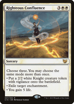 Choose three. You may choose the same mode more than once. • Create a 2/2 white Knight creature token with vigilance. • Exile target enchantment. • You gain 5 life.