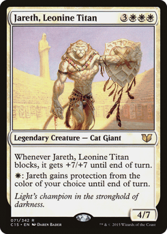 Whenever Jareth blocks, it gets +7/+7 until end of turn. {W}: Jareth gains protection from the color of your choice until end of turn.