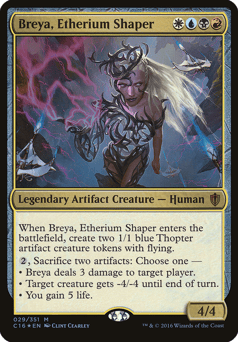 When Breya enters, create two 1/1 blue Thopter artifact creature tokens with flying. {2}, Sacrifice two artifacts: Choose one — • Breya deals 3 damage to target player or planeswalker. • Target creature gets -4/-4 until end of turn. • You gain 5 life.