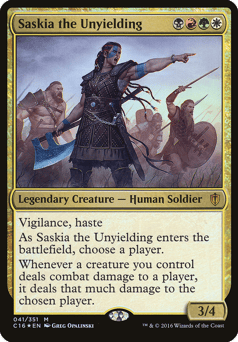 Vigilance, haste As Saskia enters, choose a player. Whenever a creature you control deals combat damage to a player, it deals that much damage to the chosen player.