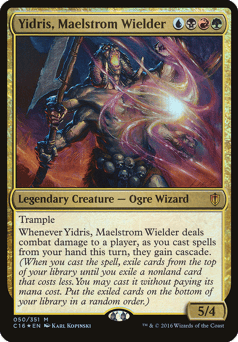 Trample Whenever Yidris deals combat damage to a player, as you cast spells from your hand this turn, they gain cascade. (When you cast the spell, exile cards from the top of your library until you exile a nonland card that costs less. You may cast it without paying its mana cost. Put the exiled cards on the bottom in a random order.)