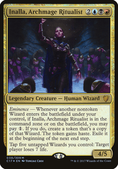 Eminence — Whenever another nontoken Wizard you control enters, if Inalla is in the command zone or on the battlefield, you may pay {1}. If you do, create a token that's a copy of that Wizard. The token gains haste. Exile it at the beginning of the next end step. Tap five untapped Wizards you control: Target player loses 7 life.