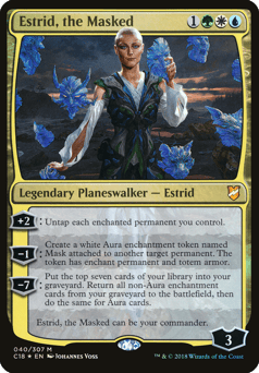 [+2]: Untap each enchanted permanent you control. [−1]: Create a white Aura enchantment token named Mask attached to another target permanent. The token has enchant permanent and umbra armor. [−7]: Mill seven cards. Return all non-Aura enchantment cards from your graveyard to the battlefield, then do the same for Aura cards. Estrid, the Masked can be your commander.