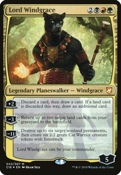 [+2]: Discard a card, then draw a card. If a land card is discarded this way, draw an additional card. [−3]: Return up to two target land cards from your graveyard to the battlefield. [−11]: Destroy up to six target nonland permanents, then create six 2/2 green Cat Warrior creature tokens with forestwalk. Lord Windgrace can be your commander.