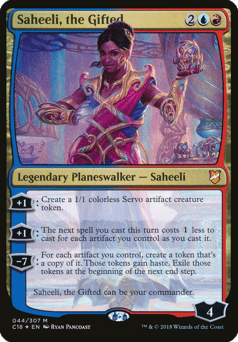 [+1]: Create a 1/1 colorless Servo artifact creature token. [+1]: The next spell you cast this turn has affinity for artifacts. (It costs {1} less to cast for each artifact you control as you cast it.) [−7]: For each artifact you control, create a token that's a copy of it. Those tokens gain haste. Exile those tokens at the beginning of the next end step. Saheeli, the Gifted can be your commander.