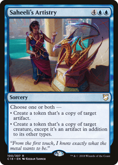 [+1]: Create a 1/1 colorless Servo artifact creature token. [+1]: The next spell you cast this turn has affinity for artifacts. (It costs {1} less to cast for each artifact you control as you cast it.) [−7]: For each artifact you control, create a token that's a copy of it. Those tokens gain haste. Exile those tokens at the beginning of the next end step. Saheeli, the Gifted can be your commander.
